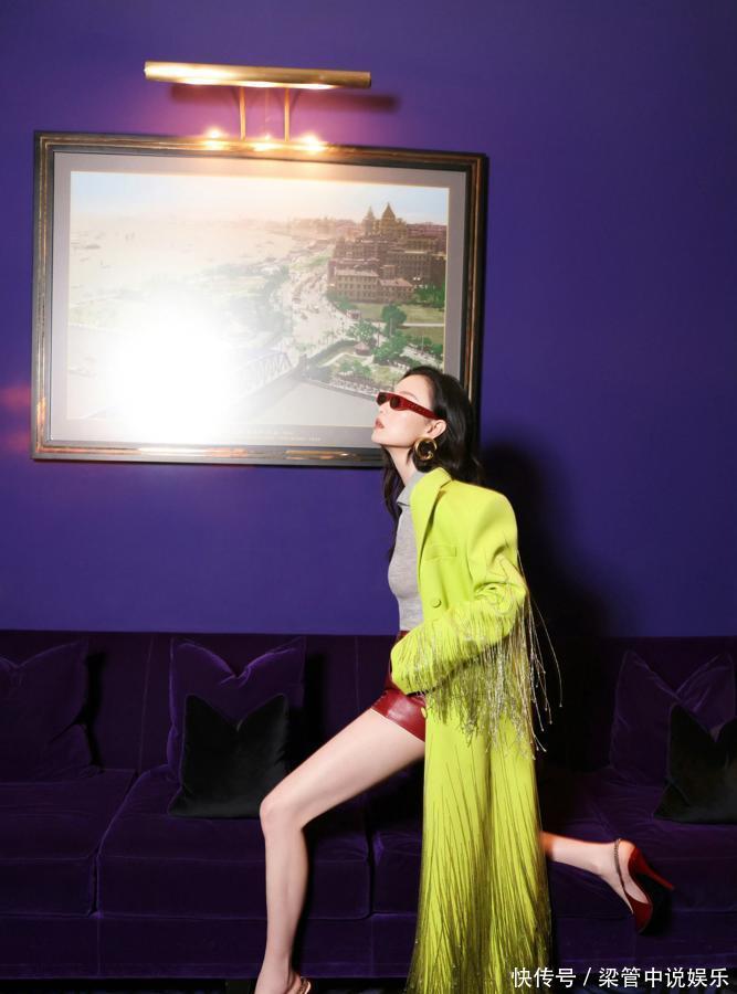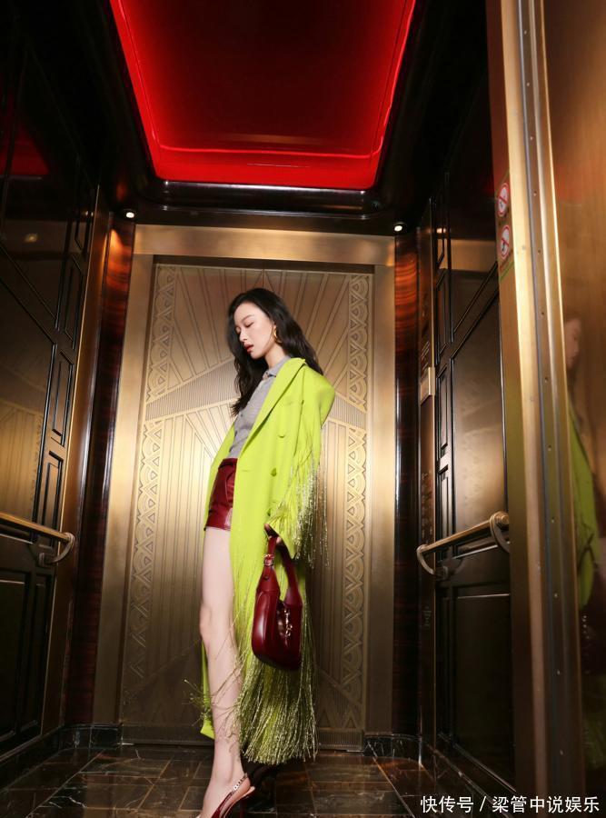 紫色沙发背景选得好。把整个造型衬得更复古了。她那种慵懒的劲儿很到位。没有硬凹造型的感觉。长腿优势确实明显。短裤和高跟鞋搭配很显比例。但普通人学这身得慎重。对身高和气质要求太高。红绿配其实容易土气。她这身居然穿出高级感。金属流苏增加了细节。让厚重的大衣有了灵动感。电梯那张照片很飒。动态感抓得不错。感觉这衣服静态看一般。动起来才好看。