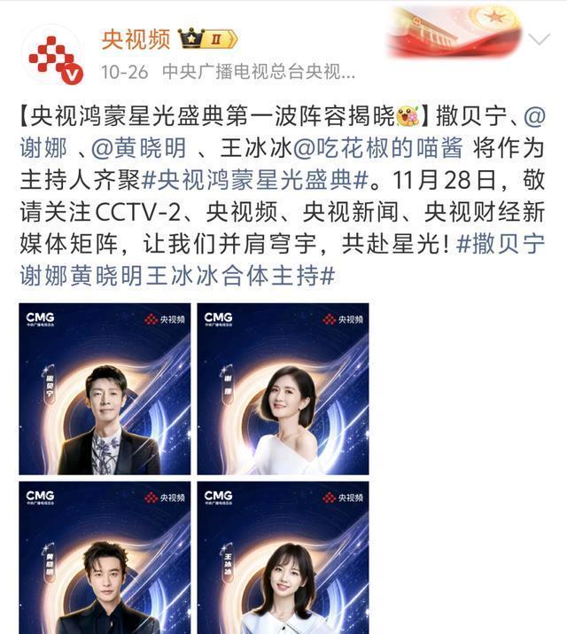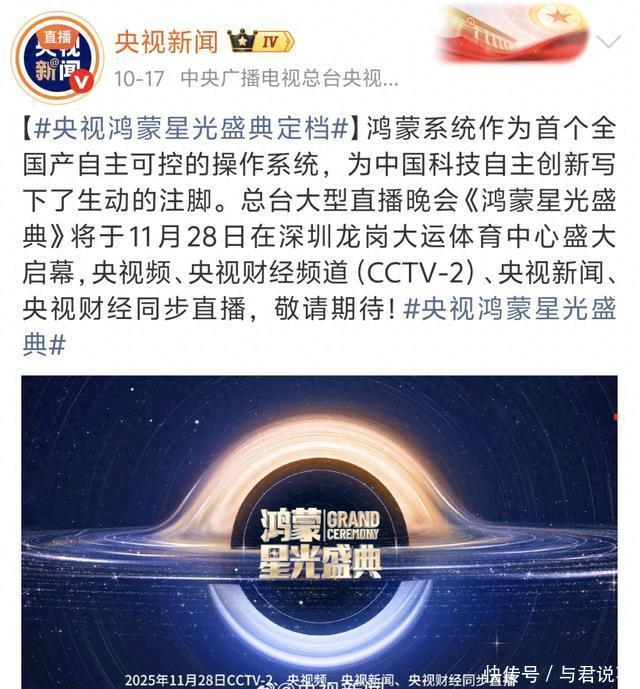 近日 央视新闻在微博平台 正式官宣 总台大型直播晚会 《鸿蒙星光盛典》 将于 11月28日 在 深圳大运中心 盛大启幕